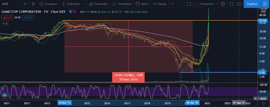 En bref, depuis deux ans, Gamestop était considéré comme un véritable mort-vivant et les gros spéculateurs de Wall Street se mirent à accumuler de gigantesques positions short sur l’action. Certes, entre août 2020 et décembre 2020, le ticker GME, comme beaucoup d’autres small caps, avait profité du bull run du stock market américain et du recovery post-lockdown, passant de 3,80$ à 22$ en 5 mois, soit une croissance de 486%.