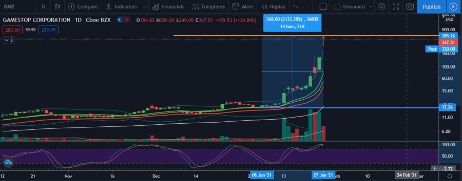 Melvin Capital avait placé pour 55 millions de dollars en short contre $GME. Les trolls de Reddit virent cette surexposition et se mirent à acheter l’action $GME en masse afin de provoquer un short squeeze contre Melvin Capital. Les trolls de Reddit refusèrent massivement de vendre leurs parts et placèrent des ordres toujours plus hauts sur les order books des plateformes, ce qui causa naturellement une explosion du prix et le short squeeze attendu. Entre le début du mois de janvier et le moment où nous rédigeons cet article, le cours de $GME est passé de 17 dollars à 373 dollars, soit une croissance de 2000% en trois semaines. Le genre de choses qu’on ne voyait guère que dans le milieu crypto jusqu’à il y a peu, mais qu’on retrouve de plus en plus sur le marché boursier traditionnel, en particulier sur les small caps et les obscurs penny stocks.